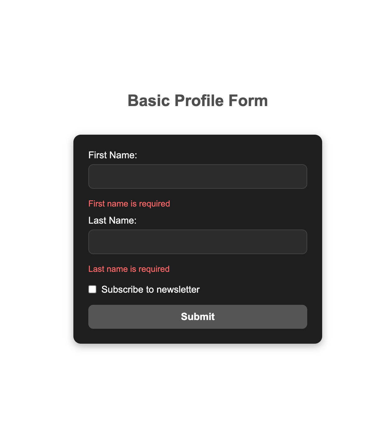 The example form consists of two required fields — First Name and Last Name — along with an optional section that appears dynamically. This optional field, Reason for subscribing, only becomes visible (and required) when the user checks the Subscribe to newsletter checkbox.